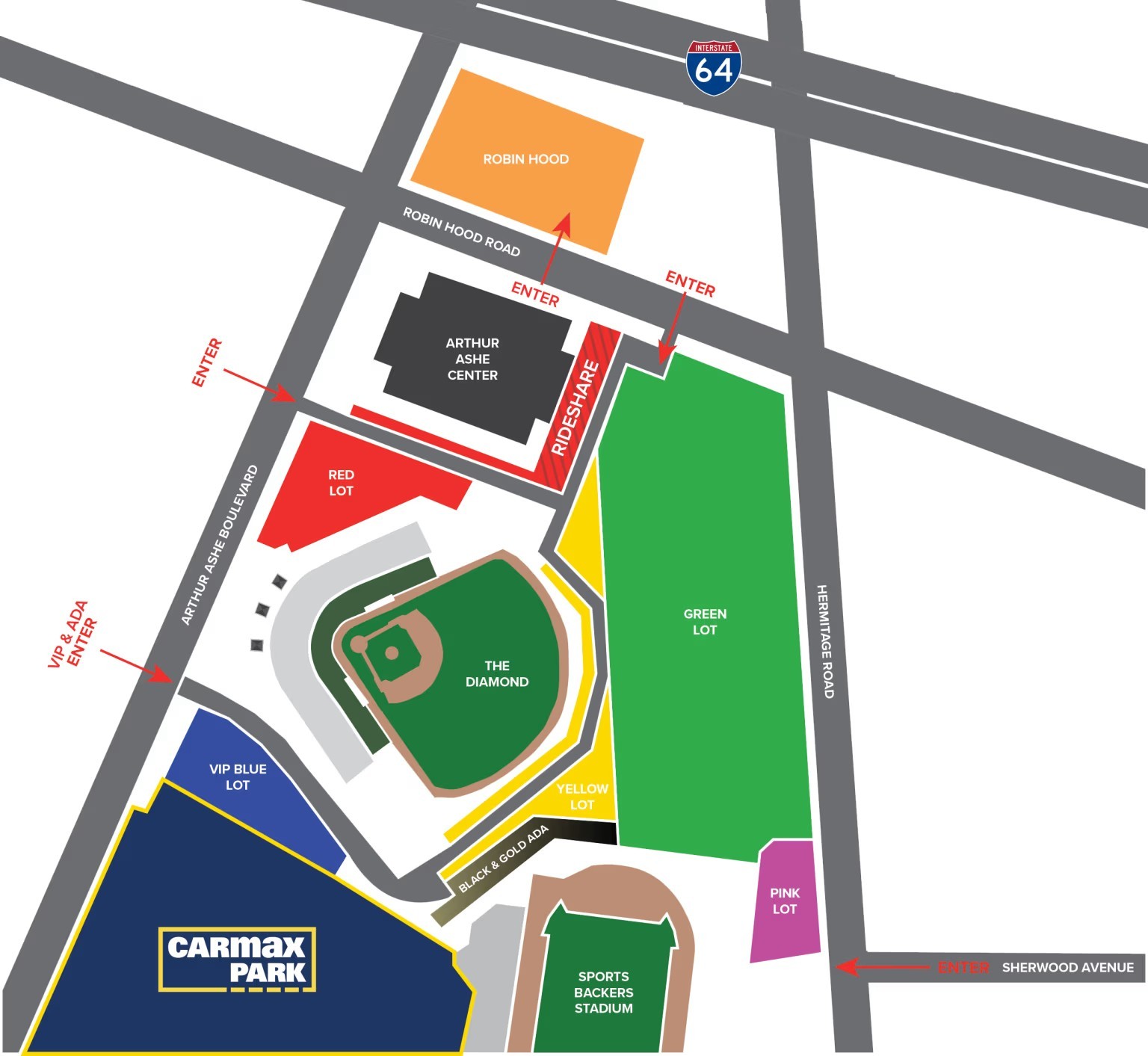 Blue Lot: Entrance off Arthur Ashe Boulevard between CarMax Park and The Diamond. VIP, Legacy Club and Annual Suite Holders only.