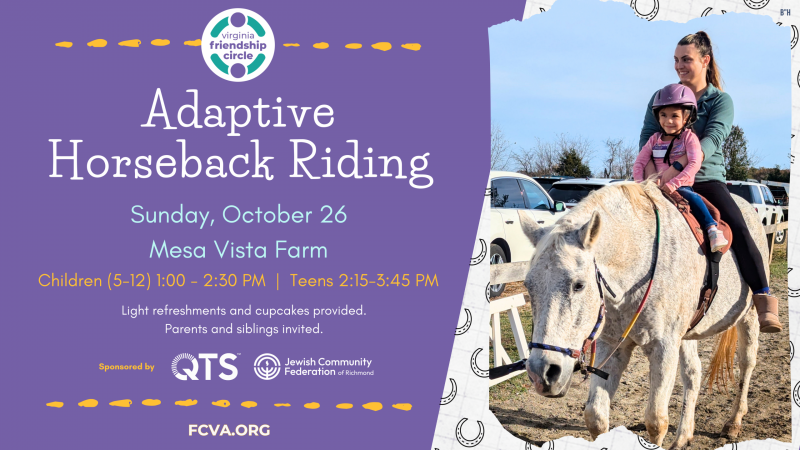 Join us at Mesa Vista Farm on Sunday, October 26, for a Friendship Circle favorite, Adaptive Horseback Riding!